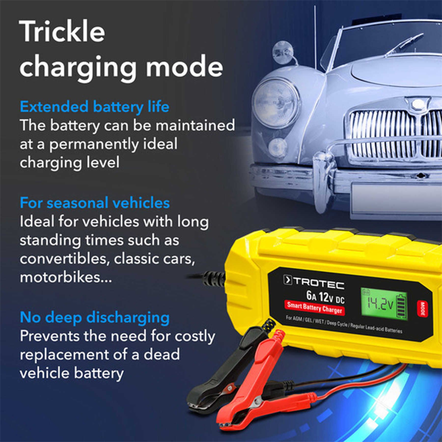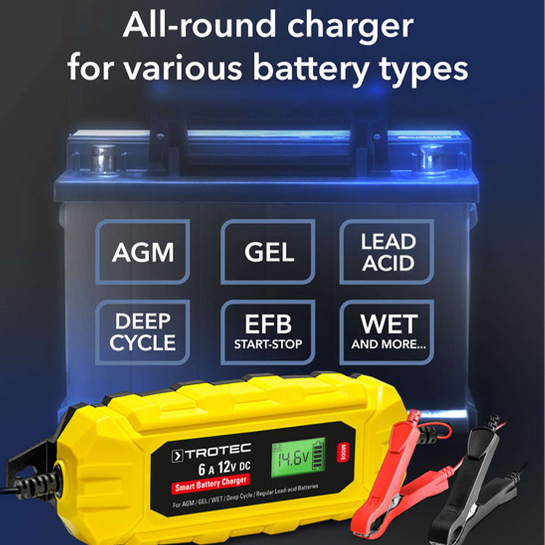 За допомогою універсального зарядного пристрою Trotec PBCS 6A ви гарантуєте надійність свого автопарку та збільшуєте термін служби акумуляторів. Особливості та функції включають: