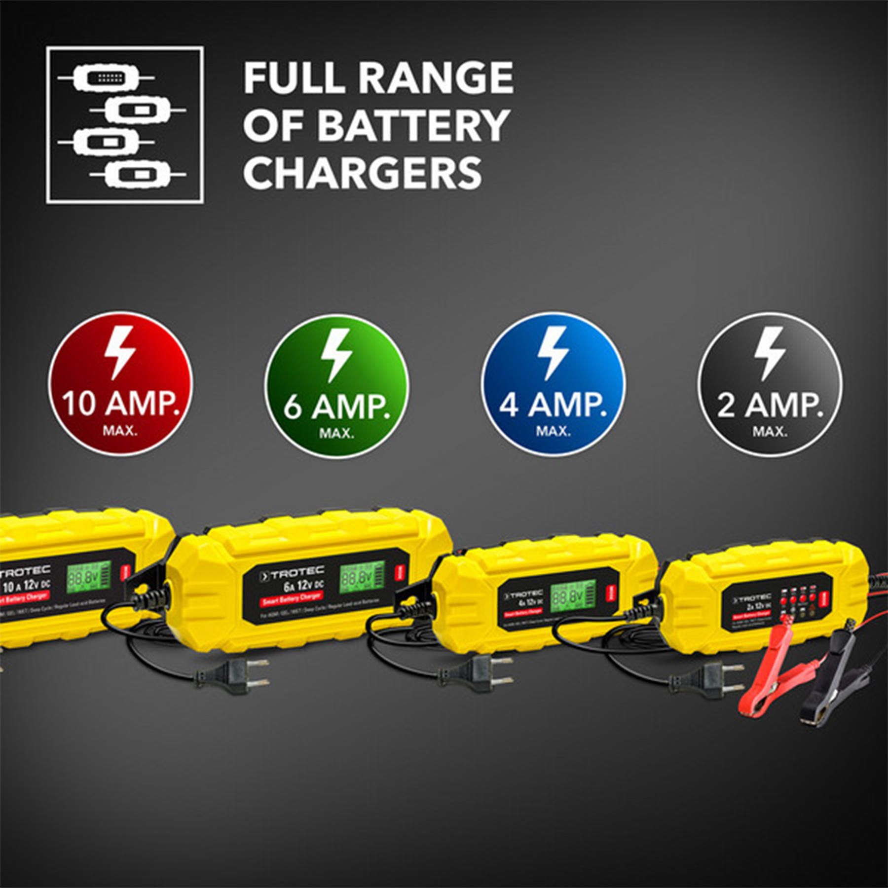 Слід уважно поставитися до вибору правильного зарядного пристрою залежно від того, скільки енергії для заряджання потрібно для вашого автомобіля. Trotec пропонує вам загалом 4 зарядні пристрої для акумуляторів, PBCS 2A , PBCS 4A , PBCS 6A та PBCS 10A, із зарядним струмом до 10 A та ємністю заряджуваних акумуляторів до 200 Ah.