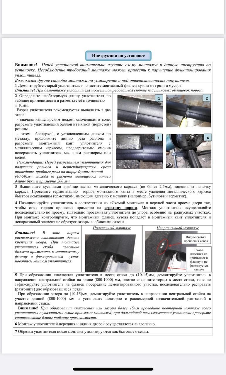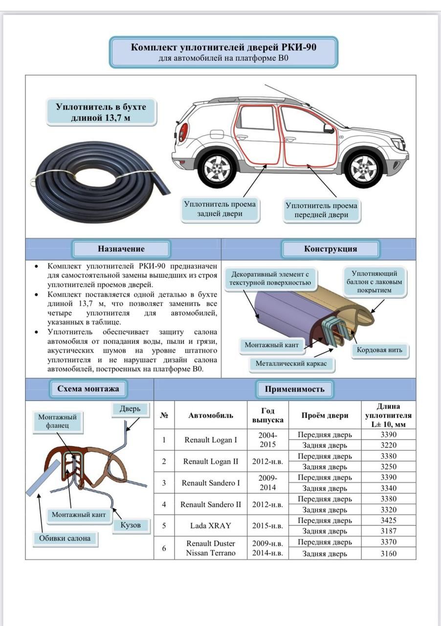 Готові встановити наші запчастини на нашому ж СТО в Києві зі збільшеною гарантією. Задати питання менеджеру в телеграм: https://t.me/avtosklad_kiev_zapchastuny, Вайбер 0939591369, Вайбер 0976904248 Ущільнювач прорізний дверцята Logan/Duster/Sandero, ВЕТ (РКІ-90) універсальний/13,7 м Ущільнювач дверей РКІ-90 постачається в бухті завдовжки 13,7 м, що дає змогу самостійно нарізати потрібний розмір, для певної моделі. RENAULT Logan I Передні двері — 3390 мм Задні двері — 3220 мм RENAULT Logan II Передні двері — 3380 мм Задні двері — 3250 мм RENAULT Sandero I Передні двері — 3390 мм Задні двері — 3340 мм RENAULT Sandero II Передні двері — 3380 мм Задні двері — 3320 мм RENAULT Duster Передні двері — 3370 мм Задні двері — 3160 мм NISSAN Terrano Передні двері — 3370 мм Задні двері — 3160 мм LADA XRAY Передні двері — 3425 мм Задні двері — 3187 мм