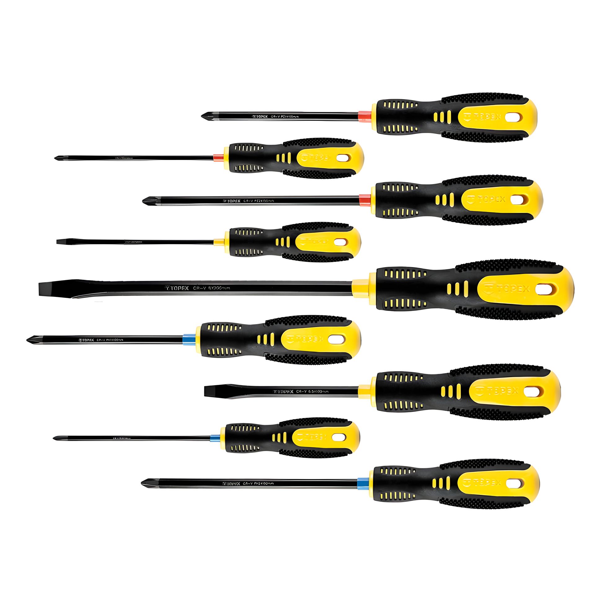 Набір викруток TOPEX призначений для виконання механічних робіт, а також робіт, які виконують майстри-аматори. Стрижень кожної з дев'яти викруток виготовлений із міцної хромомолібденової сталі, що забезпечує тривалий термін служби інструменту. Магнітне жало із загартованої сталі полегшує роботу з інструментом. Ергономічна пластмасова рукоятка, покрита антиковзним матеріалом, забезпечує комфорт та безпеку під час роботи. Бренд TOPEX призначений для домашніх майстрів.