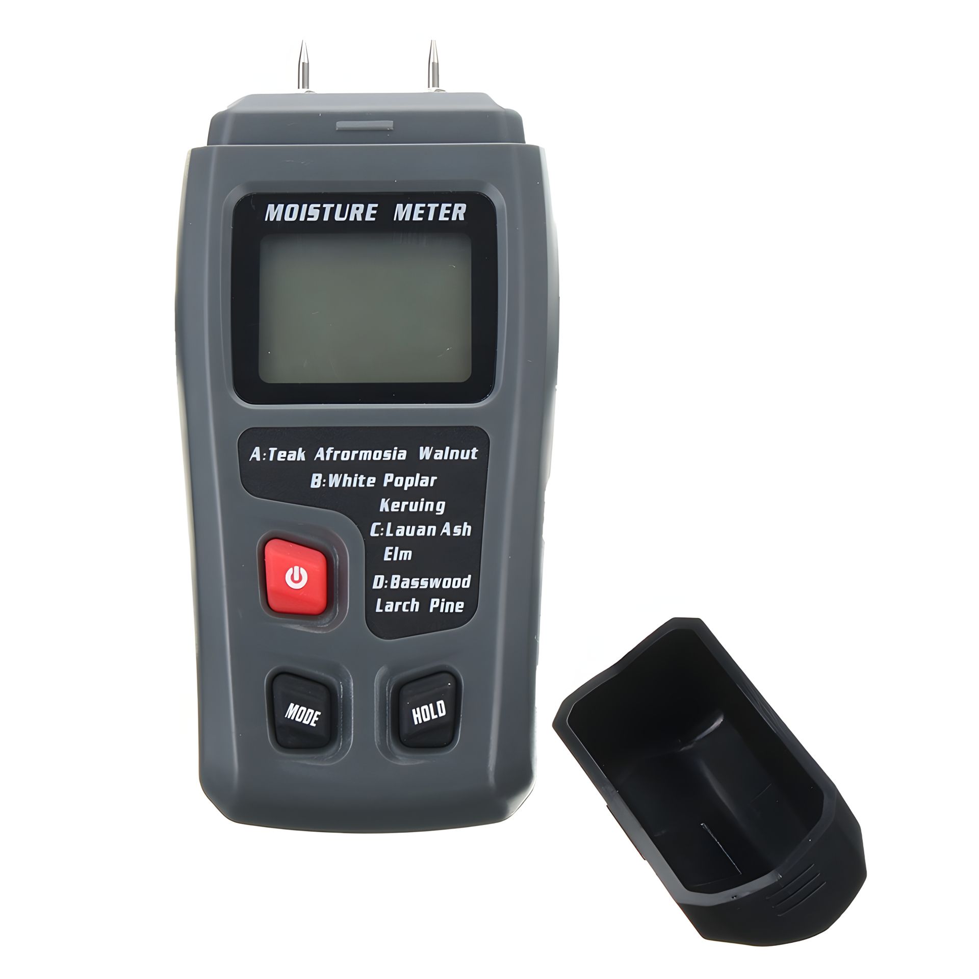 - Пристрій для вимірювання вологості має 4 режими проведення вимірювань. Вибір режиму залежить від вмісту смоли в деревині, вологість якої необхідно визначити. Режими підібрані від "А" - менш смолиста деревина (наприклад тик); до "D" - важка деревина хвойних порід (наприклад ялина). Перемикання режимів здійснюється за допомогою кнопки "Mode". Різноманітність режимів розширює діапазон досліджень до 100 типів і видів деревини.