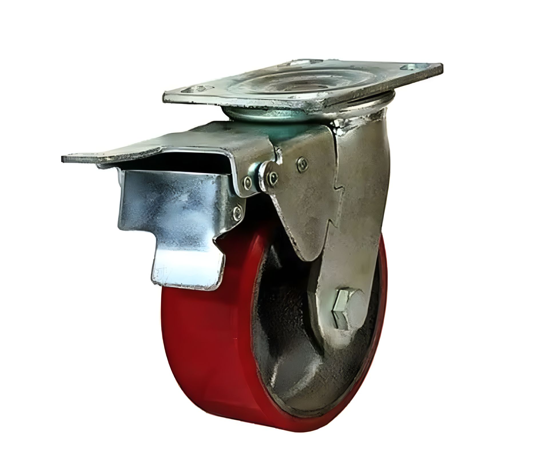 Колесо посилене поліуретан/чаун, з поворотним кронштейном і гальмом використовується для пересування різних вантажів на складських візках і будівельному обладнанні як у приміщенні, так і за його межами.