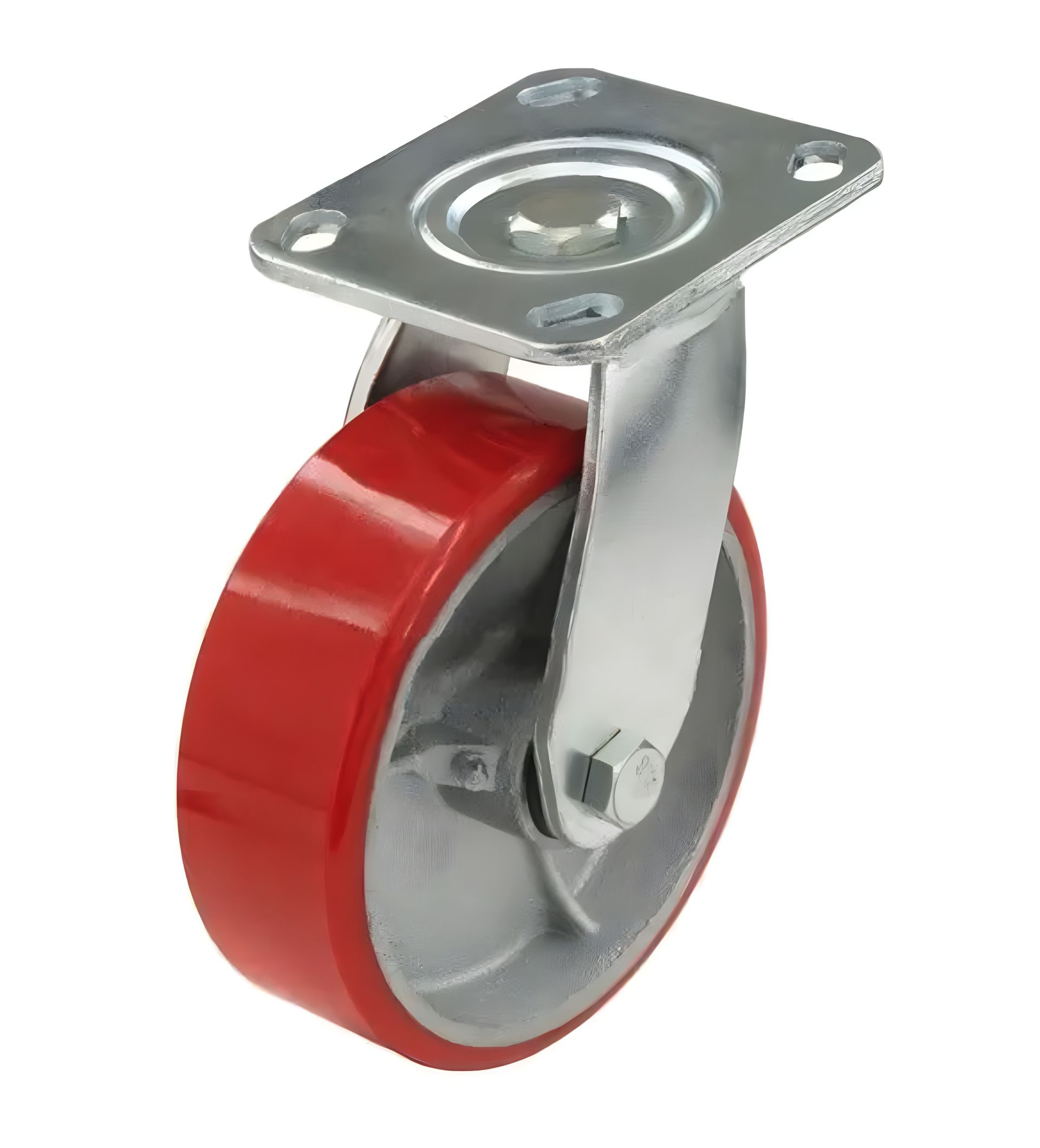Диск цього більшого вантажного колеса відлитий із чавуну, який покритий поліуретановим контактним шаром. Такий дует дає змогу з легкістю витримувати великі навантаження до 430 кг. де під час експлуатації зберігається гарна маневровість, легкість ходу навіть за невеликих перешкод на шляху. Укомплектоване чавунне колесо з поліуретановим контактним шаром роликовим підшипником і поворотним кронштейном з оцинкованого металу завтовшки 5 мм. Завдяки покриттю з поліуретану, воно має робочий температурний діапазон від -40 до +50 градусів. Підвищена стійкість під час контакту з оліями.