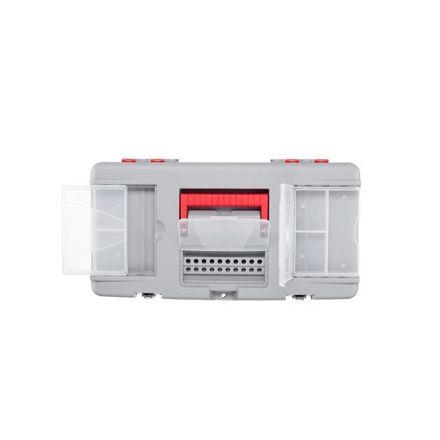 На кришці ящика розташовані два органайзери, які відмінно підходять для зберігання кріплень або будь-яких інших витратних матеріалів. Також зверху передбачено відсік для біт, який закривається прозорою кришкою. Усередині ящика розміщена полиця для зберігання губцевого та іншого невеликого інструменту, який часто використовується.
