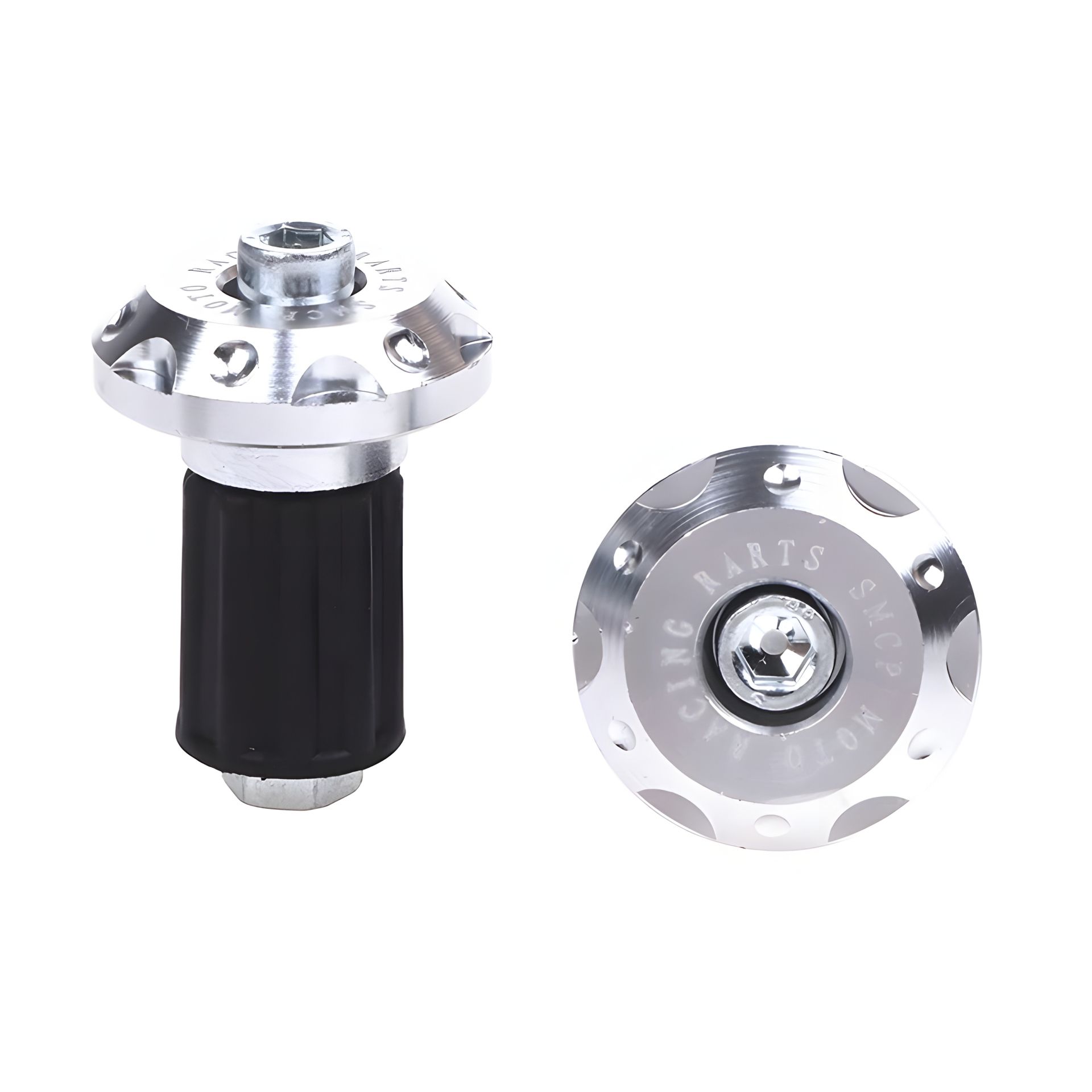 Заглушки на кермо мотоцикла, скутера та велосипеда сріблясті. Кріплення на трубку керма. Затискні внутрішні хомути Виконані з алюмінію. Затискати шестигранником. Розмір зовнішній гумки 17-19 мм - те, що входить у трубку керма. При стягуванні, діаметр збільшується. Загальна довжина 45 мм. Вага 63 грами. Коробка 9 грн. пошти.