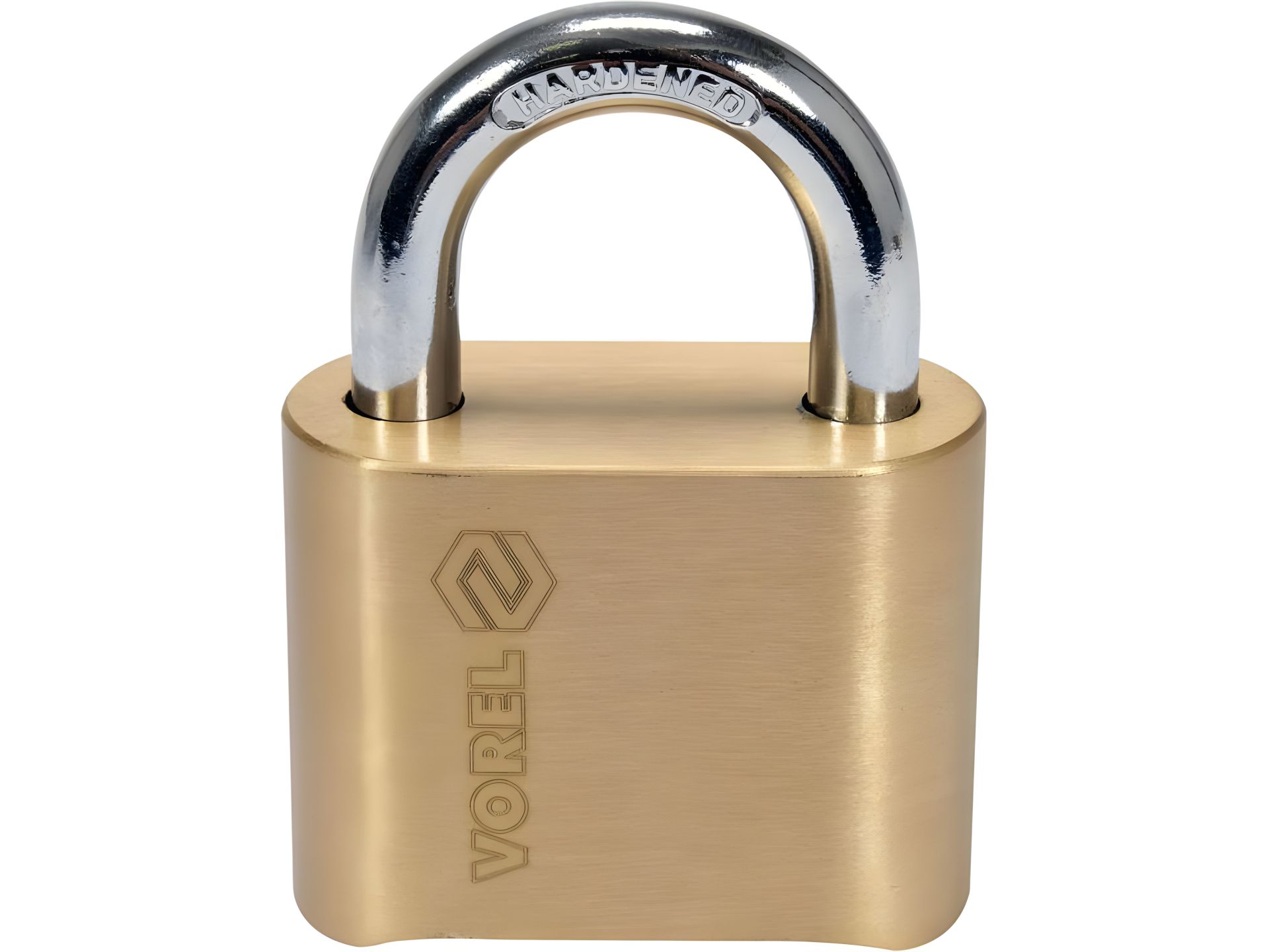 Навісний замок з кодовим замиканням: латунний корпус 50х40х25 мм, сталева дуга 23х25х8 мм Vorel 77612