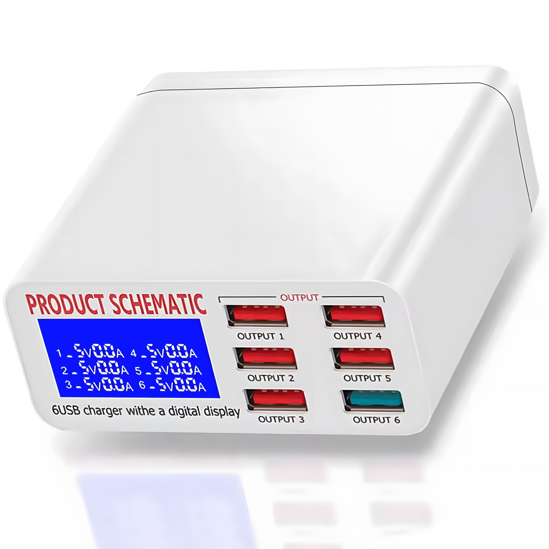 На лицевій стороні пристрою, лівіше від зарядних портів знаходиться LED дисплей, на якому можливо спостерігати всі показники щодо кожного USB порту у реальному часі.