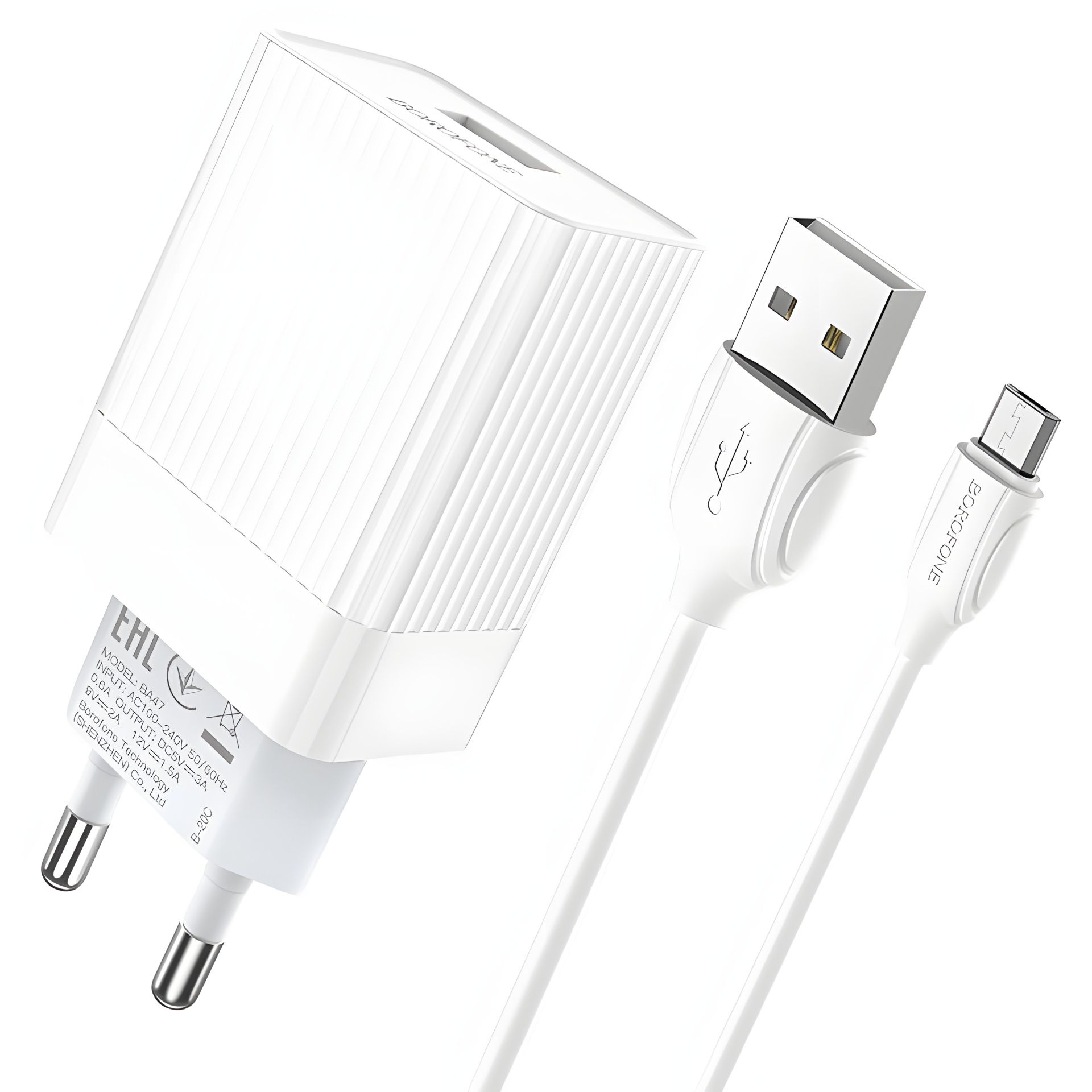 Мережевий зарядний пристрій Borofone BA23A з кабелем USB to MicroUSB, 2USB, 2.4A, білий В наявності