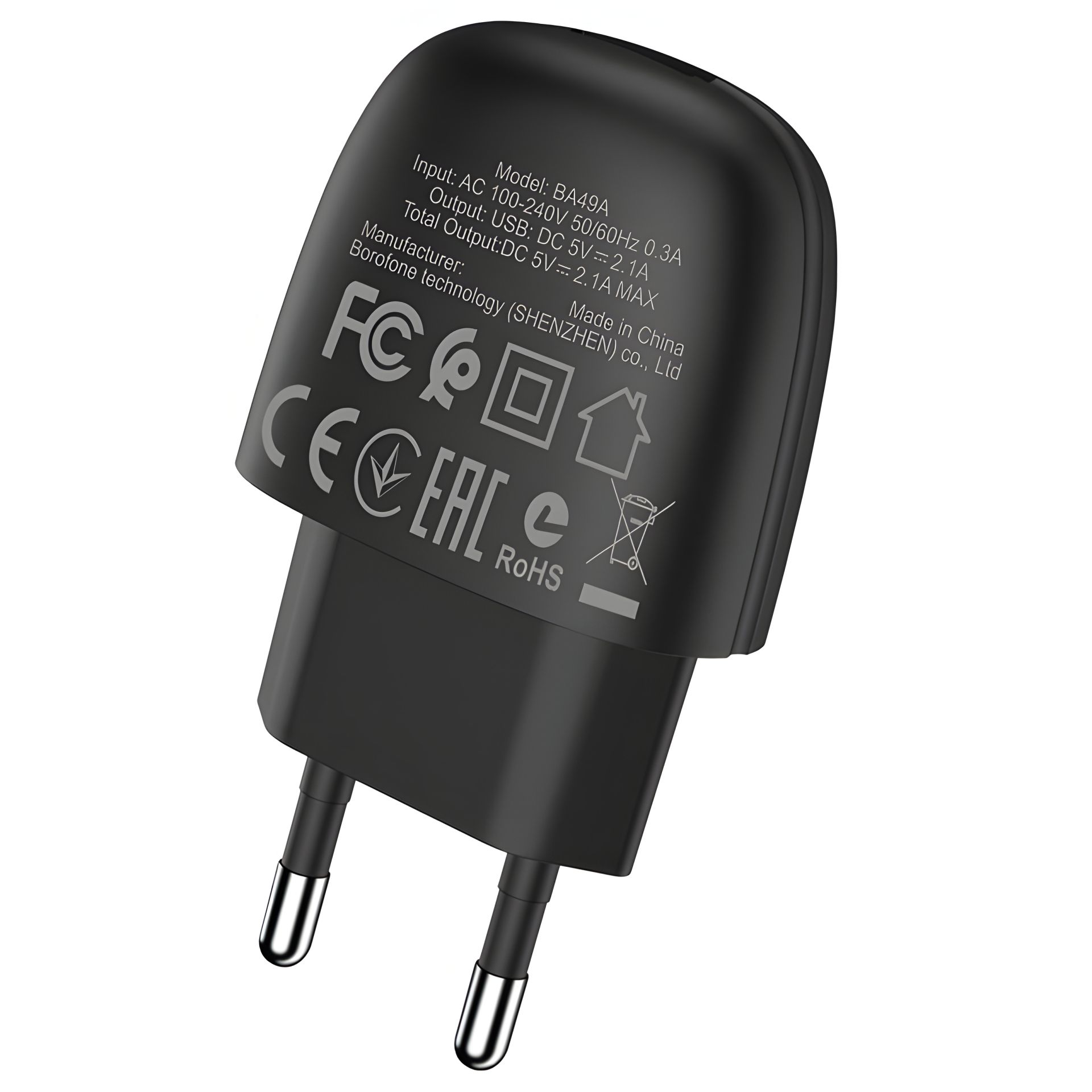 Мережевий зарядний пристрій Borofone BA68A, кабель USB to Lightning, 1USB, 2.1A, чорний