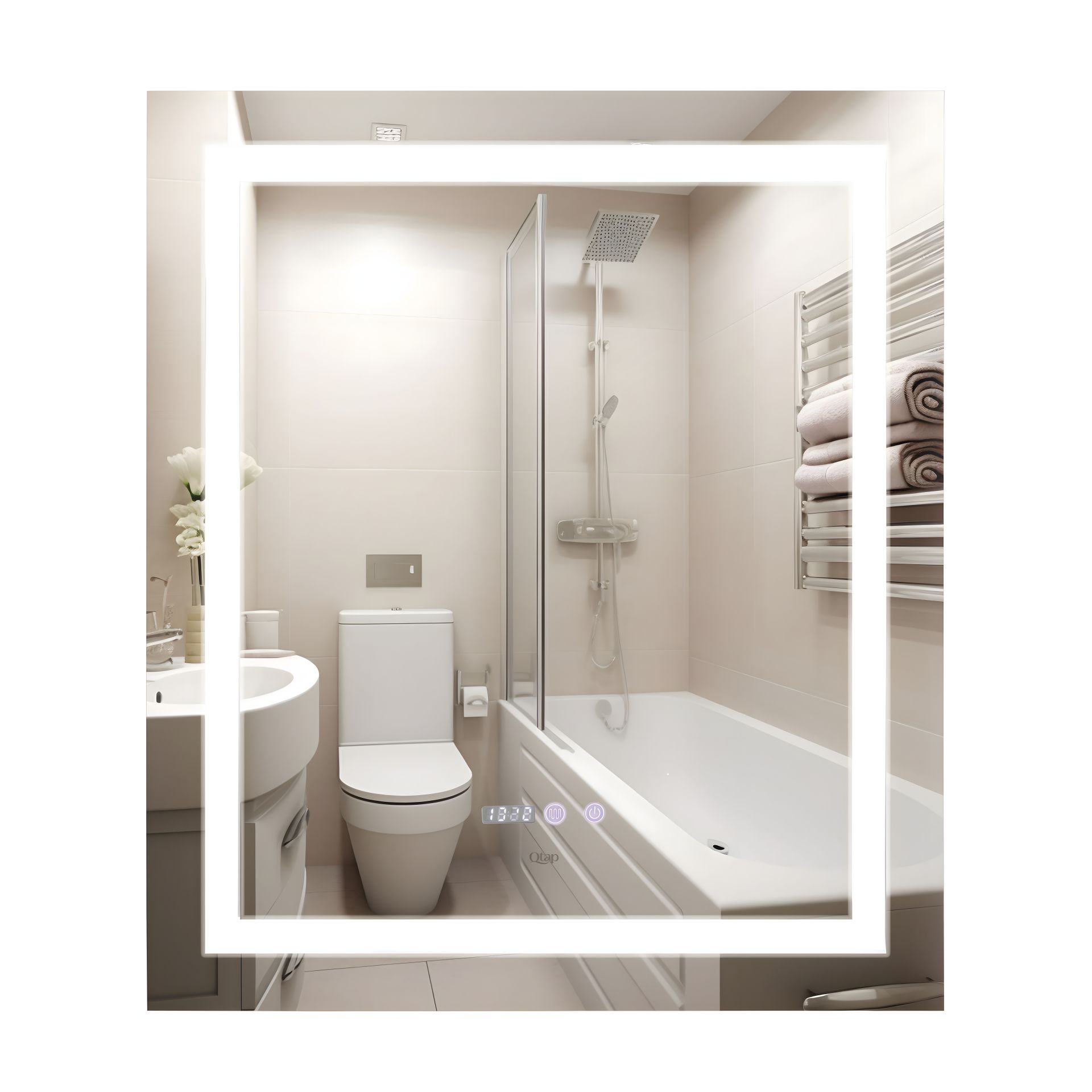 Дзеркало у ванну з підсвіткою, з антизапотіванням, з годинником, димером Qtap Mideya 70х80 см (QT2078DCF7080W) прямокутної форми. Розміри дзеркала складають 700х800 мм. Особливості дзеркала Qtap Mideya (QT2078DCF7080W): LED підсвітка Підсвітка по периметру дзеркала робить його використання сучасним, зручним і функціональним. Світіння холодного білого кольору. Режим антизапотівання Даний режим ANTI-FOG допомагає запобігти запотіванню дзеркала під час прийняття душу або ванни. Поверхня дзеркала підтримується трохи теплою, тим самим запобігаючи конденсації вологи на ньому. Сенсорне управління За допомогою сенсорних кнопок на лицьовій поверхні дзеркала можна вмикати та вимикати LED підсвітку та режим антизапотівання. Димер За допомогою димера можна регулювати яскравість LED підсвітки дзеркала. Годинник та температура У дзеркало вмонтовано годинник та індикатор температури навколишнього середовища в градусах Цельсія. Встановлення Встановлення дзеркала просте і зручне, кріпиться безпосередньо на стіну. Живлення дзеркала: від мережі змінного струму 100/240 В.