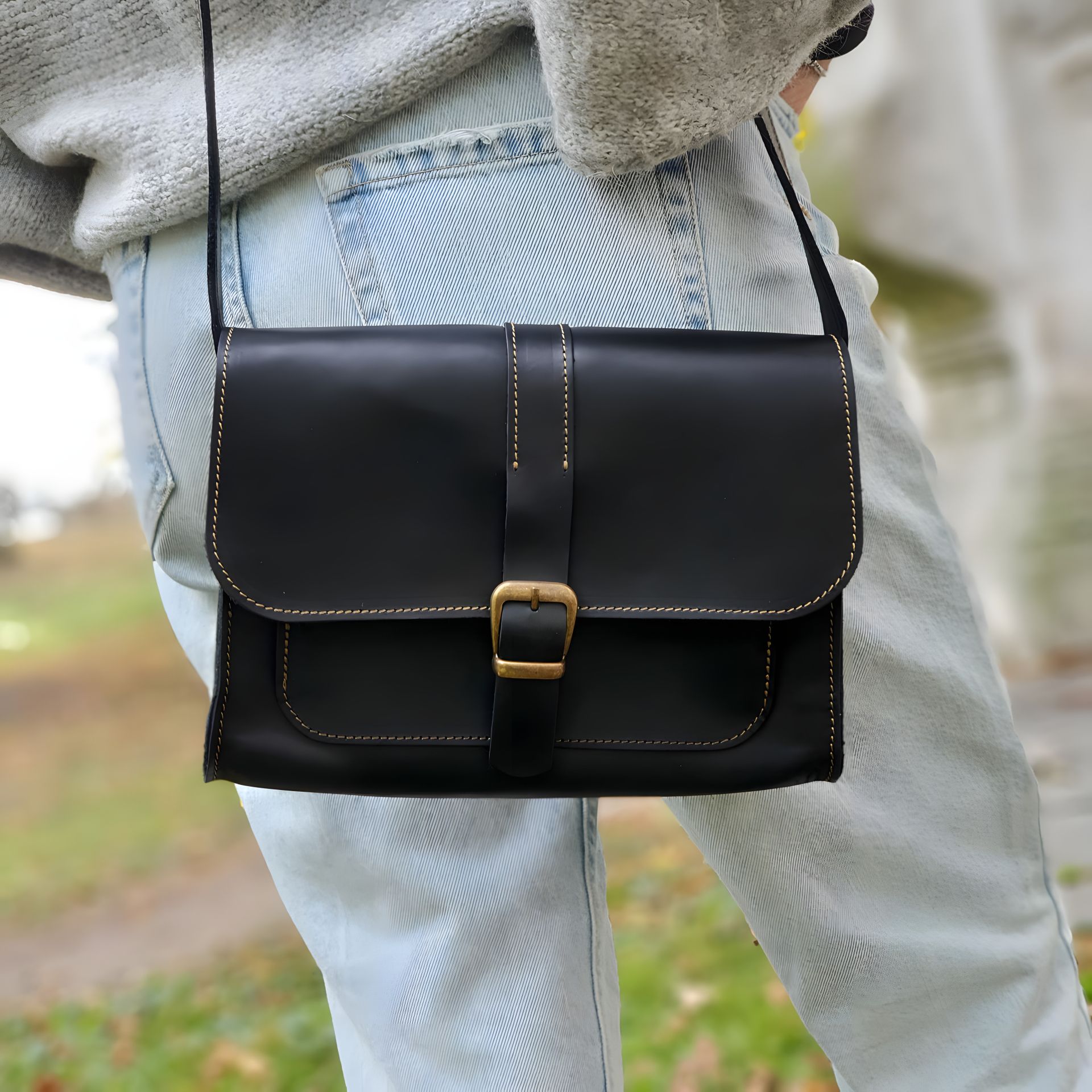 Жіноча сумка з ременем через плече , пошита з щільної натуральної шкіри , обробленої воском - вінтажної Crazy Horse . У сумці одне основне містке відділення, яке закривається блискавкою. У ньому легко поміститься гаманець, ключниця та всі необхідні дрібниці. Спереду на тильній сторні зручна кишеня з невеликим об'ємом. У ньому добре поміщається телефон. Вся сумка закривається клапаном з декоративною пряжкою. Ремінь через плече шкіряний та регулюється по довжині.