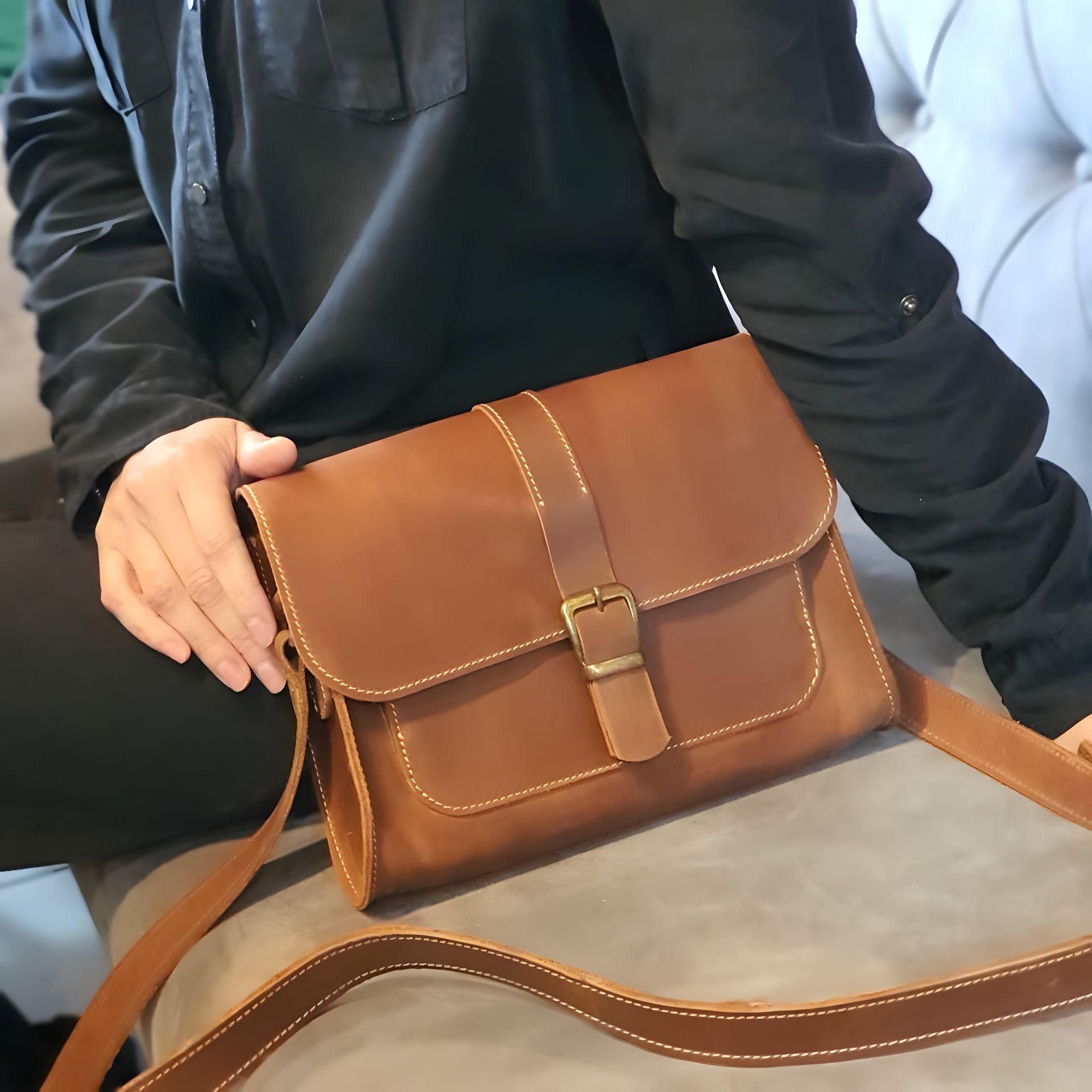 Жіноча сумка з ременем через плече , пошита з щільної натуральної шкіри , обробленої воском - вінтажної Crazy Horse . У сумці одне основне містке відділення, яке закривається блискавкою. У ньому легко поміститься гаманець, ключниця та всі необхідні дрібниці. Спереду на тильній сторні зручна кишеня з невеликим об'ємом. У ньому добре поміщається телефон. Вся сумка закривається клапаном з декоративною пряжкою. Ремінь через плече шкіряний та регулюється по довжині.