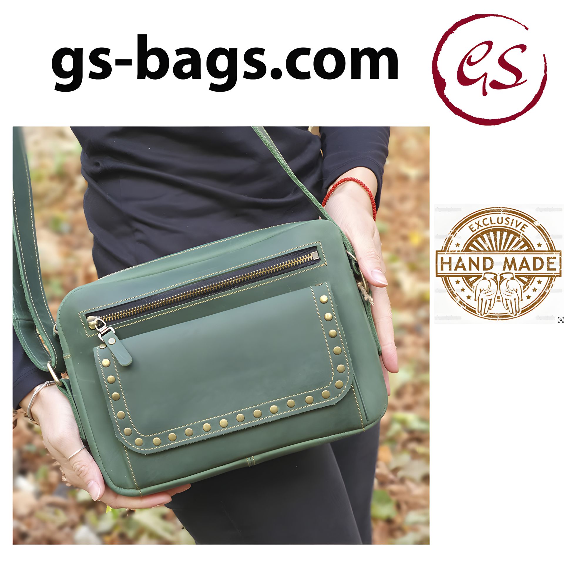 Шкіряна жіноча сумка з ременем через плече , зеленого кольору.