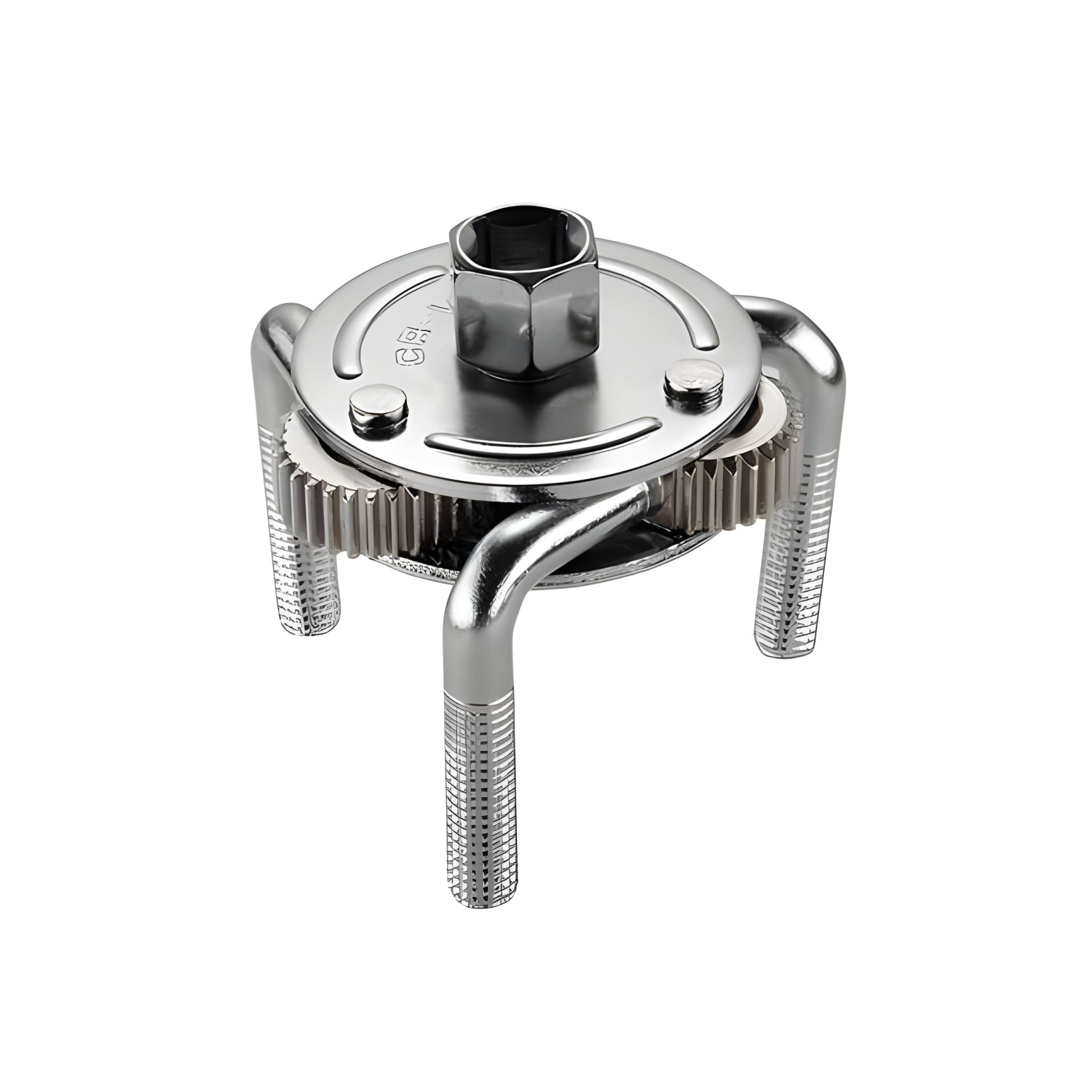 Знімач виготовлений з міцного металу з додатковим покриттям проти корозії. У конструкції передбачено три ніжки з насічками, які перешкоджають зісковзуванню фільтра. За допомогою тріскачки або воротка приводиться в дію затискний механізм, ніжки надійно обтискають і фіксують фільтр, це дозволяє його легко демонтувати. Інструмент можна використовувати для демонтажу фільтрів різних розмірів, що особливо зручно в обмеженому просторі.